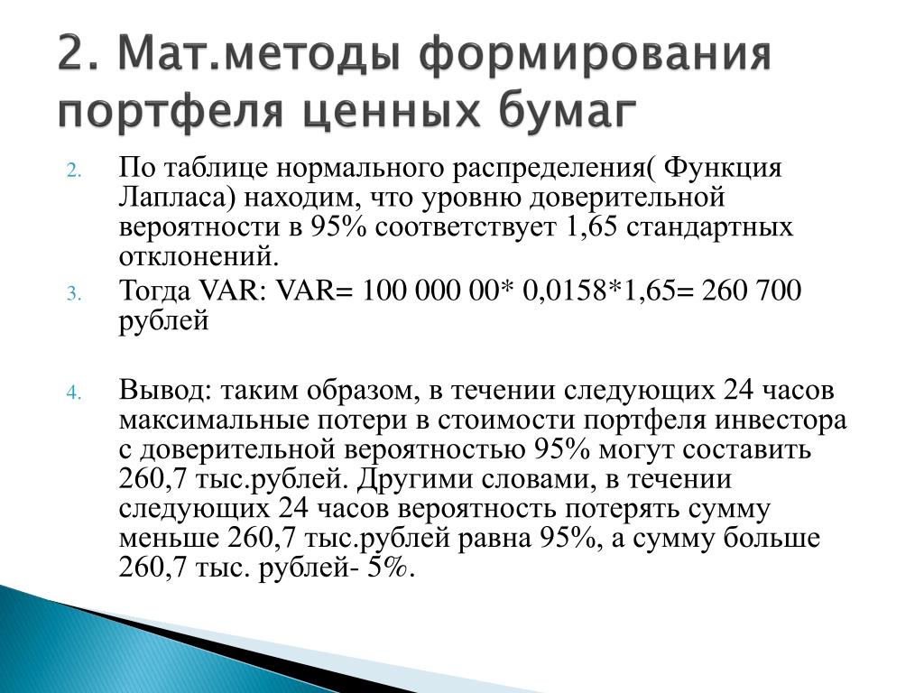 2. Мат.методы формирования портфеля ценных бумаг • По таблице нормального распределения( Функция Лапласа) находим, что уровню доверительной вероятности в 95% соответствует 1,65 стандартных отклонений. • Тогда VAR:VAR= 100 000 00* 0,0158*1,65= 260 700 рублей • Вывод: таким образом, в течении следующих 24 часов максимальные потери в стоимости портфеля инвестора с доверительной вероятностью 95% могут составить 260,7 тыс.рублей. Другими словами, в течении следующих 24 часов вероятность потерять сумму меньше 260,7 тыс.рублей равна 95%, а сумму больше 260,7 тыс. рублей- 5%.