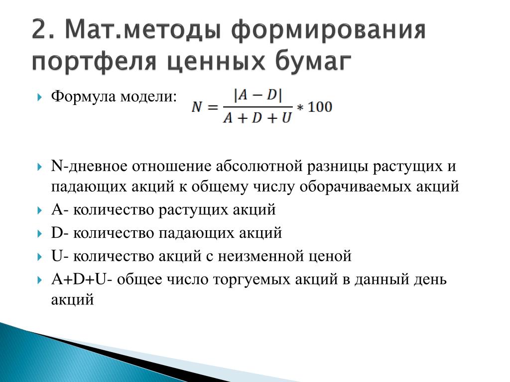 2. Мат.методы формирования портфеля ценных бумаг • Формула модели: • N-дневное отношение абсолютной разницы растущих и падающих акций к общему числу оборачиваемых акций • A- количество растущих акций • D- количество падающих акций • U- количество акций с неизменной ценой • A+D+U- общее число торгуемых акций в данный день акций