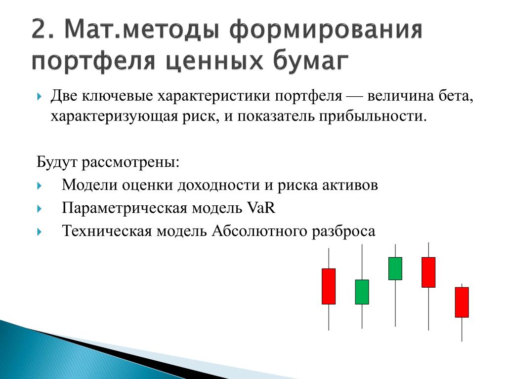 2. Мат.методы формирования портфеля ценных бумаг • Две ключевые характеристики портфеля — величина бета, характеризующая риск, и показатель прибыльности. Будут рассмотрены: • Модели оценки доходности и риска активов • Параметрическая модель VaR • Техническая модель Абсолютного разброса