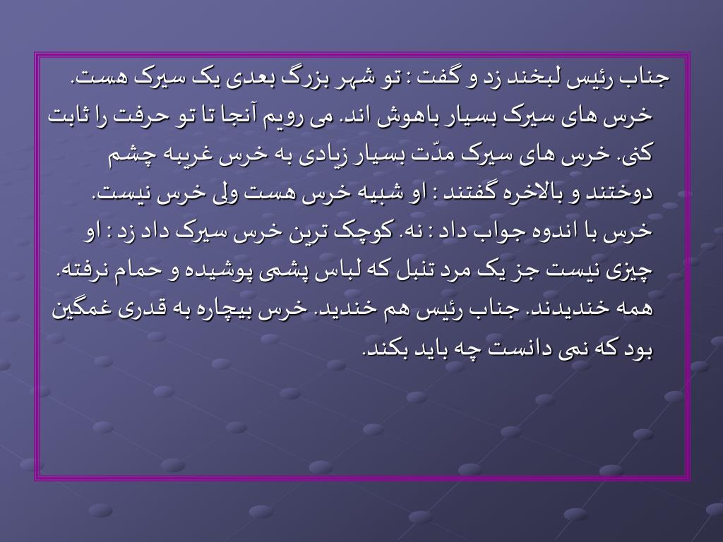 جناب رئيس لبخند زد و گفت : تو شهر بزرگ بعدی يک سيرک هست. خرس های سيرکبسيار باهوش اند. می رويم آنجا تا تو حرفت را ثابت کنی. خرس های سيرک مدّت بسيار زيادی بهخرس غريبه چشم دوختند و بالاخره گفتند : او شبيه خرس هست ولی خرس نيست. خرس با اندوهجواب داد : نه. کوچک ترين خرس سيرک داد زد : او چيزی نيست جز يک مرد تنبل که لباسپشمی پوشيده و حمام نرفته. همه خنديدند. جناب رئيس هم خنديد. خرس بيچاره به قدری غمگينبود که نمی دانست چه بايد بکند.