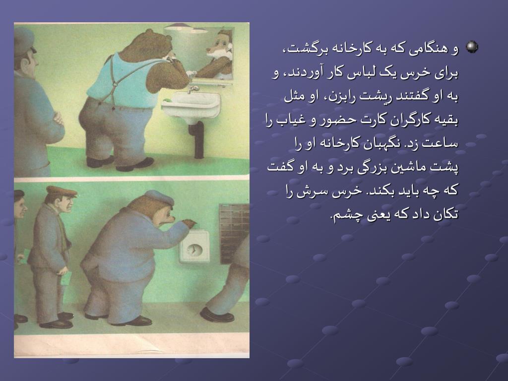 و هنگامی که به کارخانه برگشت، برای خرس يک لباس کار آوردند، و به او گفتند ريشت رابزن، او مثل بقيه کارگران کارت حضور و غياب را ساعت زد. نگهبان کارخانه او را پشت ماشينبزرگی برد و به او گفت که چه بايد بکند. خرس سرش را تکان داد که يعنی چشم.