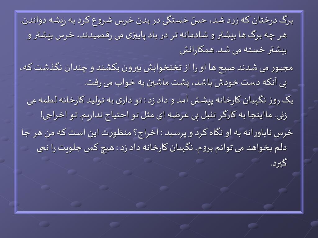 برگ درختان که زرد شد، حسّ خستگی در بدن خرس شروع کرد به ريشه دواندن. هر چهبرگ ها بيشتر و شادمانه تر در باد پاييزی می رقصيدند، خرس بيشتر و بيشتر خسته می شد. همکارانش مجبور می شدند صبح ها او را از تختخوابش بيرون بکشند و چندان نگذشت که، بی آنکه دستخودش باشد، پشت ماشين به خواب می رفت. یک روز نگهبان کارخانه پيشش آمد و داد زد : تو داری به توليد کارخانه لطمه می زنی. مااينجا به کارگر تنبل بی عرضه ای مثل تو احتياج نداريم. تو اخراجی! خرس ناباورانه به او نگاه کرد و پرسيد : اخراج؟ منظورت اين است که من هر جا دلم بخواهدمی توانم بروم. نگهبان کارخانه داد زد : هيچ کس جلويت را نمی گيرد.