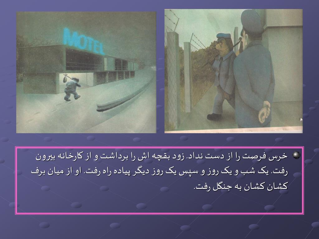 خرس فرصت را از دست نداد. زود بقچه اش را برداشت و از کارخانه بيرون رفت. يکشب و يک روز و سپس يک روز ديگر پياده راه رفت. او از ميان برف کشان کشان به جنگل رفت.