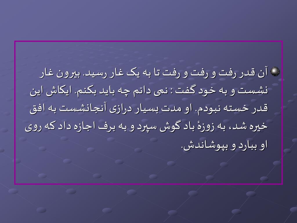 آن قدر رفت و رفت و رفت تا به يک غار رسيد. بيرون غار نشست و به خود گفت : نمی دانم چه بايدبکنم. ایکاش اين قدر خسته نبودم. او مدت بسيار درازی آنجانشست به افق خيره شد، به زوزهٔباد گوش سپرد و به برف اجازه داد که روی او ببارد و بپوشاندش.