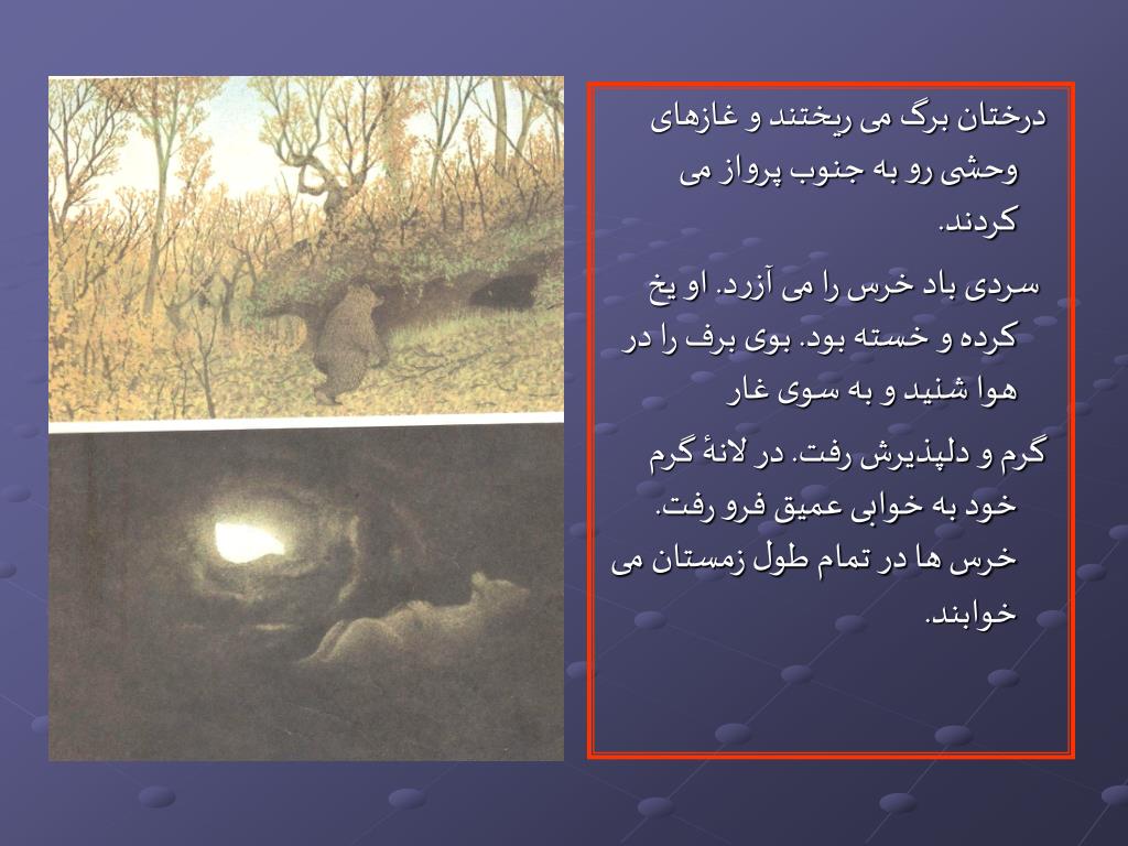 درختان برگ می ريختند و غازهای وحشی رو به جنوب پرواز می کردند. سردی باد خرس را می آزرد. او يخ کرده و خسته بود. بوی برف را در هوا شنيد و به سوی غار گرم و دلپذيرش رفت. در لانهٔ گرم خود به خوابی عميق فرو رفت. خرس ها در تمام طول زمستان می خوابند.