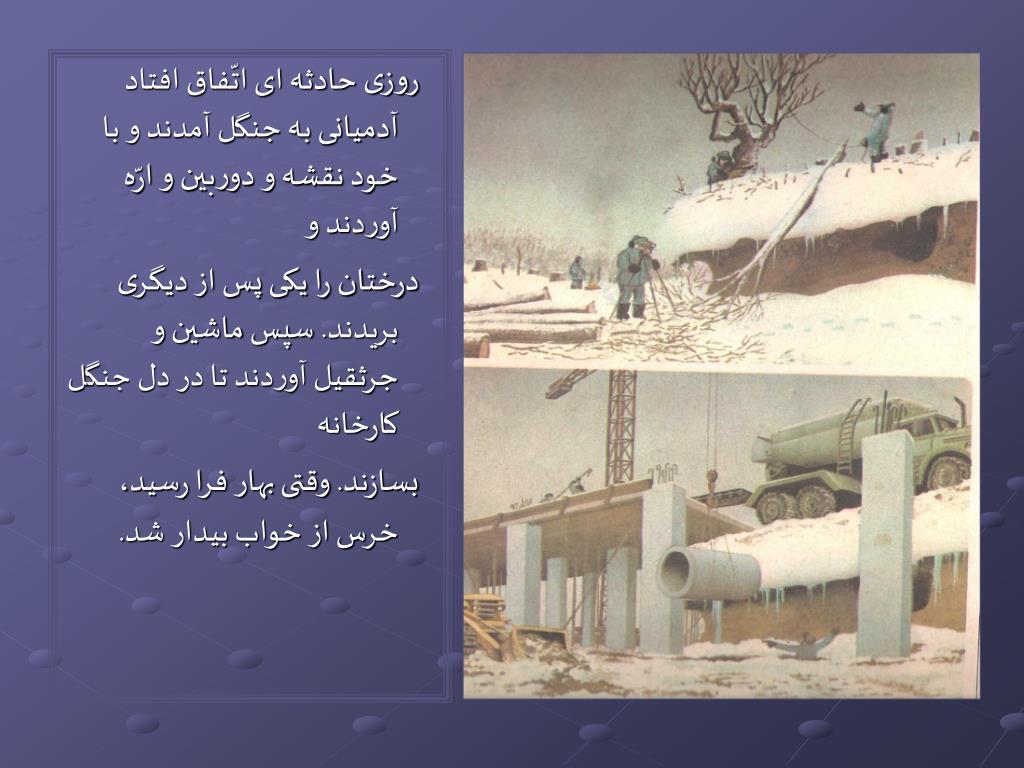 روزی حادثه ای اتّفاق افتاد آدميانی به جنگل آمدند و با خود نقشه و دوربين و ارّه آوردند و درختان را يکی پس از ديگری بريدند. سپس ماشين و جرثقيل آوردند تا در دل جنگل کارخانه بسازند. وقتی بهار فرا رسيد، خرس از خواب بيدار شد.