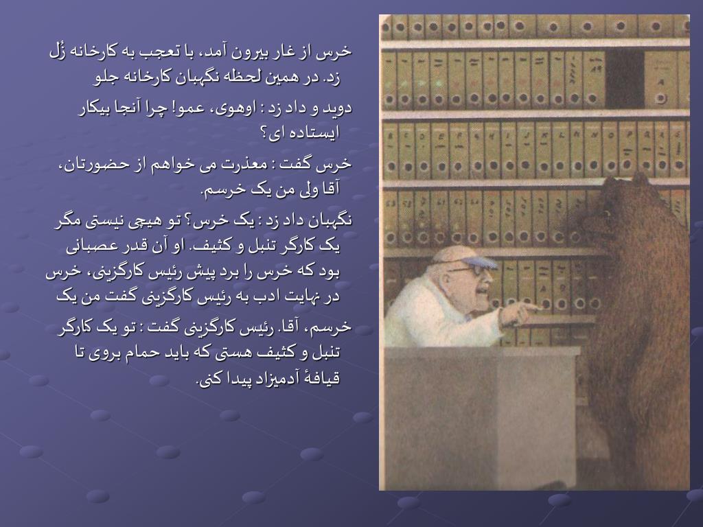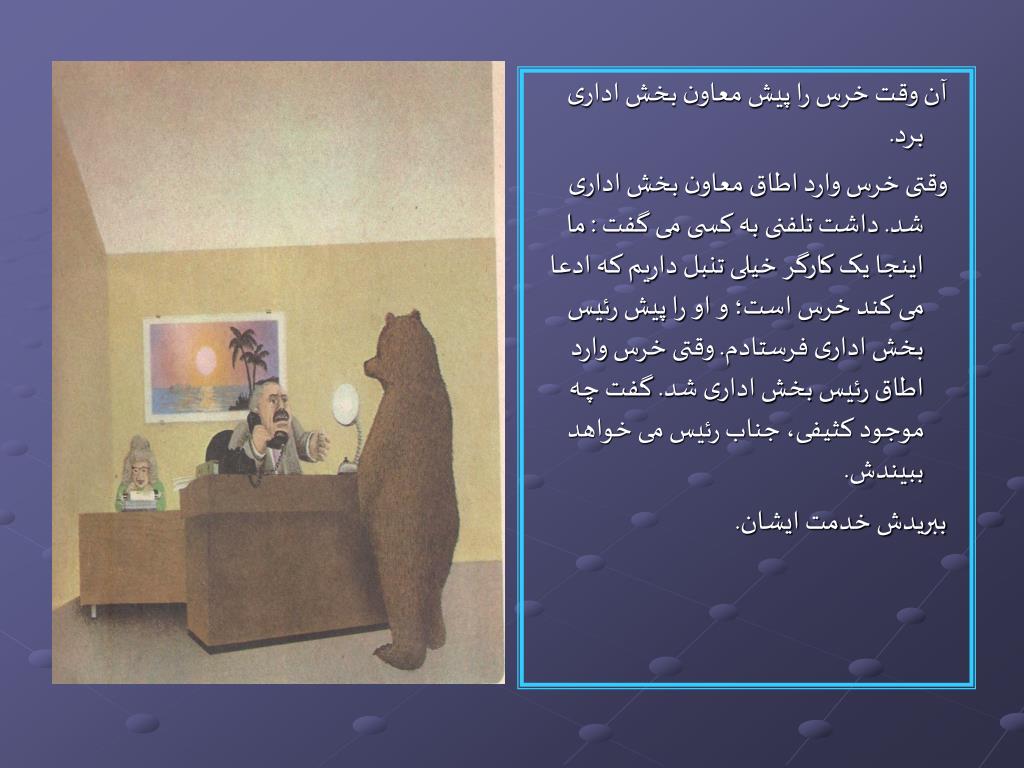 آن وقت خرس را پيش معاون بخش اداری برد. وقتی خرس وارد اطاق معاون بخش اداری شد. داشت تلفنی به کسی می گفت : ما اينجا يککارگر خيلی تنبل داريم که ادعا می کند خرس است؛ و او را پيش رئيس بخش اداری فرستادم. وقتیخرس وارد اطاق رئيس بخش اداری شد. گفت چه موجود کثيفی، جناب رئيس می خواهد ببيندش. ببريدش خدمت ايشان.