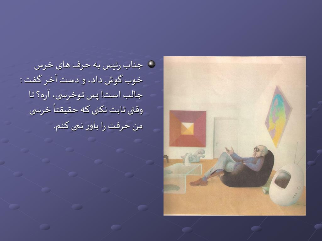جناب رئيس به حرف های خرس خوب گوش داد، و دست آخر گفت : جالب است! پس توخرسی، آره؟ تا وقتی ثابت نکنی که حقيقتاً خرسی من حرفت را باور نمی کنم.