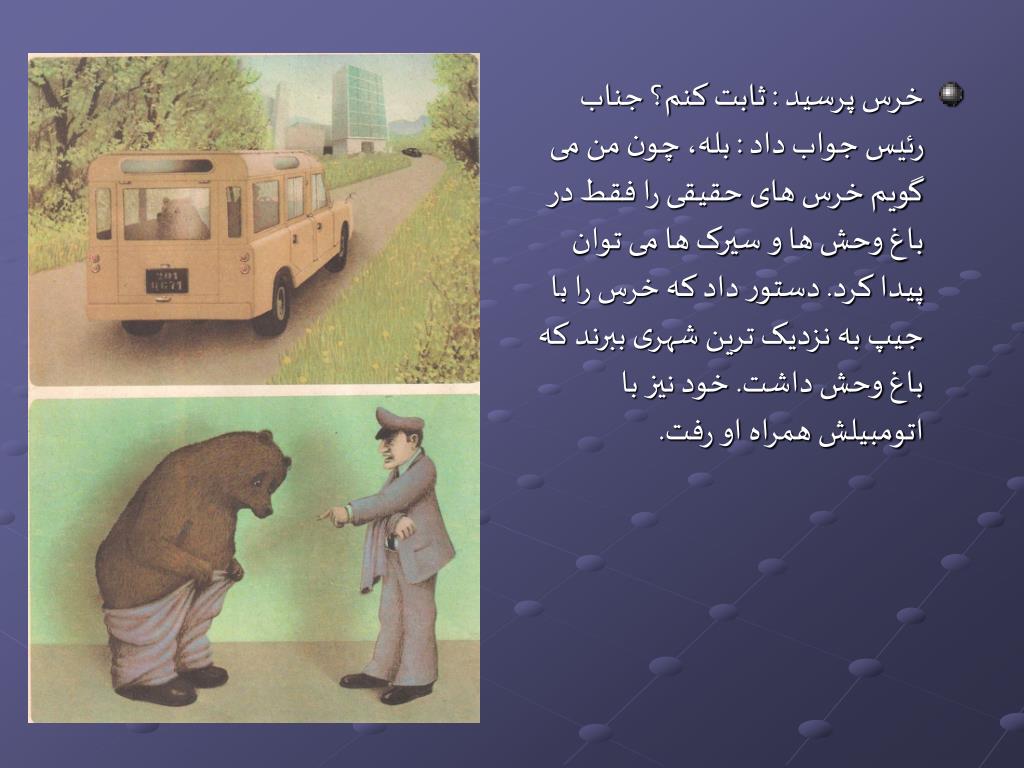 خرس پرسيد : ثابت کنم؟ جناب رئيس جواب داد : بله، چون من می گويم خرس های حقيقیرا فقط در باغ وحش ها و سيرک ها می توان پيدا کرد. دستور داد که خرس را با جيپ به نزديک ترينشهری ببرند که باغ وحش داشت. خود نيز با اتومبيلش همراه او رفت.