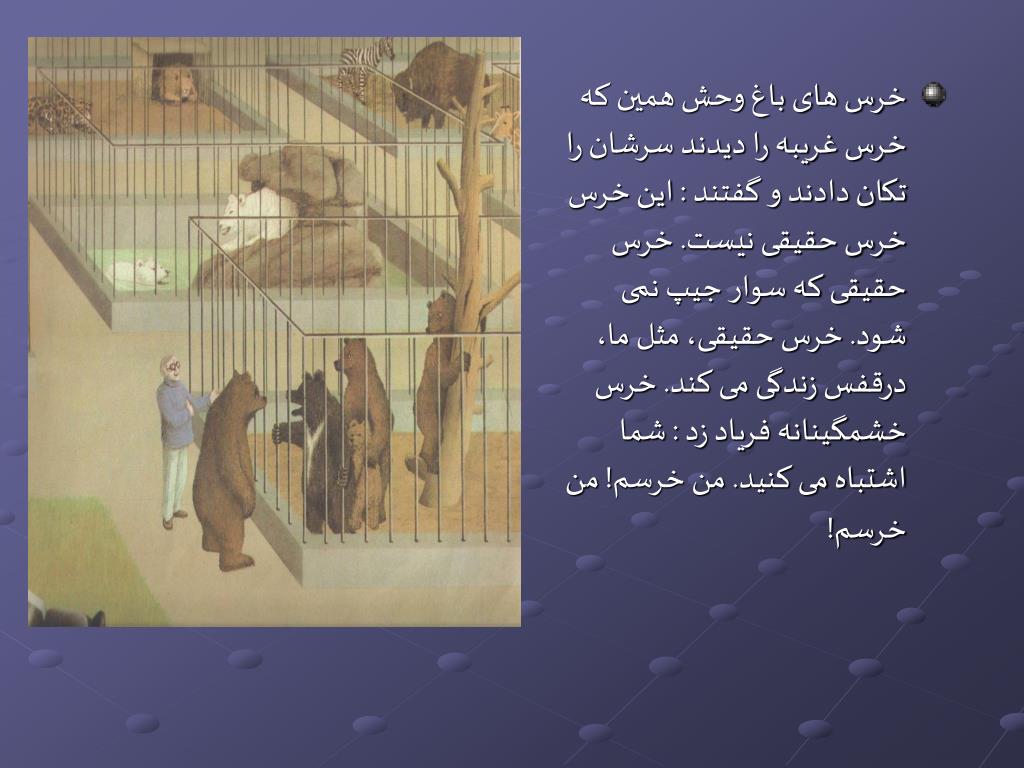 خرس های باغ وحش همين که خرس غريبه را ديدند سرشان را تکان دادند و گفتند : اينخرس خرس حقيقی نيست. خرس حقيقی که سوار جيپ نمی شود. خرس حقيقی، مثل ما، درقفسزندگی می کند. خرس خشمگينانه فرياد زد : شما اشتباه می کنيد. من خرسم! من خرسم!
