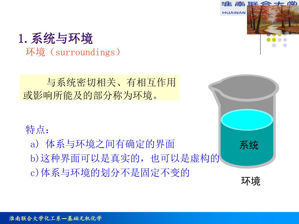 系统 环境 1.系统与环境 环境(surroundings) 与系统密切相关、有相互作用或影响所能及的部分称为环境。 特点: a) 体系与环境之间有确定的界面 b)这种界面可以是真实的,也可以是虚构的 c)体系与环境的划分不是固定不变的