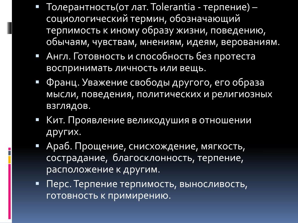 Толерантность(от лат. Tolerantia - терпение) – социологический термин, обозначающий терпимость к иному образу жизни, поведению, обычаям, чувствам, мнениям, идеям, верованиям. • Англ. Готовность и способность без протеста воспринимать личность или вещь. • Франц. Уважение свободы другого, его образа мысли, поведения, политических и религиозных взглядов. • Кит. Проявление великодушия в отношении других. • Араб. Прощение, снисхождение, мягкость, сострадание, благосклонность, терпение, расположение к другим. • Перс. Терпение терпимость, выносливость, готовность к примирению.