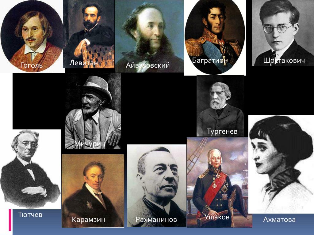 Багратион Шостакович Левитан Гоголь Айвазовский Тургенев Мичурин Тютчев Ушаков Карамзин Рахманинов Ахматова