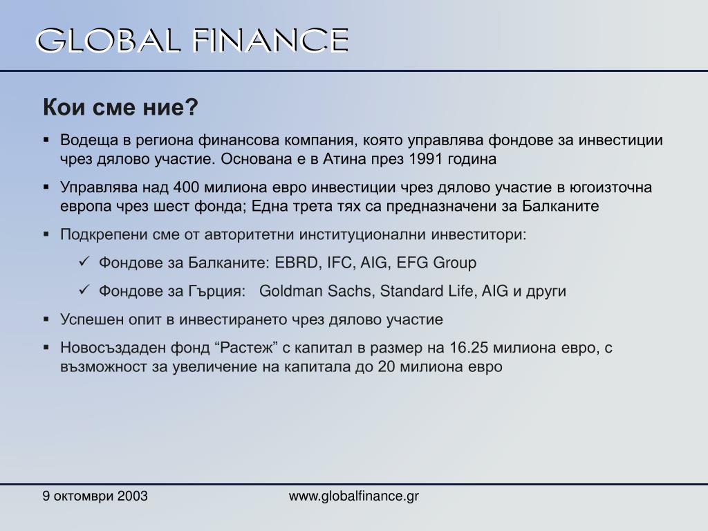 Кои сме ние? • Водеща в региона финансова компания, която управлява фондове за инвестиции чрез дялово участие. Основана е в Атина през 1991 година • Управлява над 400 милиона евро инвестиции чрез дялово участие в югоизточна европа чрез шест фонда; Една трета тях са предназначени за Балканите • Подкрепени сме от авторитетни институционални инвеститори: • Фондове за Балканите: EBRD, IFC, AIG,EFG Group • Фондове за Гърция: Goldman Sachs, Standard Life, AIG и други • Успешен опит в инвестирането чрез дялово участие • Новосъздаден фонд “Растеж” с капитал в размер на 16.25 милиона евро, с възможност за увеличение на капитала до 20 милиона евро www.globalfinance.gr