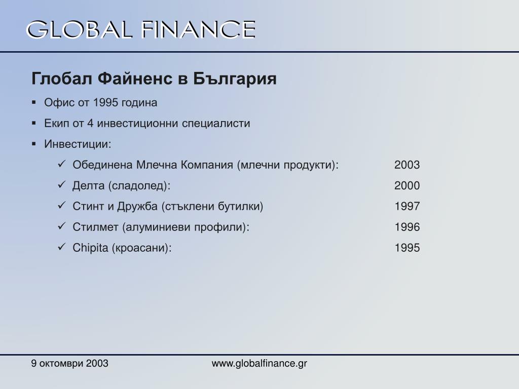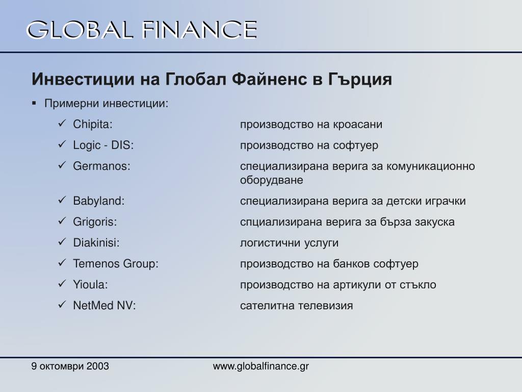 Инвестиции на Глобал Файненс в Гърция • Примерни инвестиции: • Chipita: производство на кроасани • Logic - DIS: производство на софтуер • Germanos: специализирана верига за комуникационно оборудване • Babyland: специализирана верига за детски играчки • Grigoris: спциализирана верига за бърза закуска • Diakinisi: логистични услуги • Temenos Group: производство на банков софтуер • Yioula: производство на артикули от стъкло • NetMed NV: сателитна телевизия www.globalfinance.gr