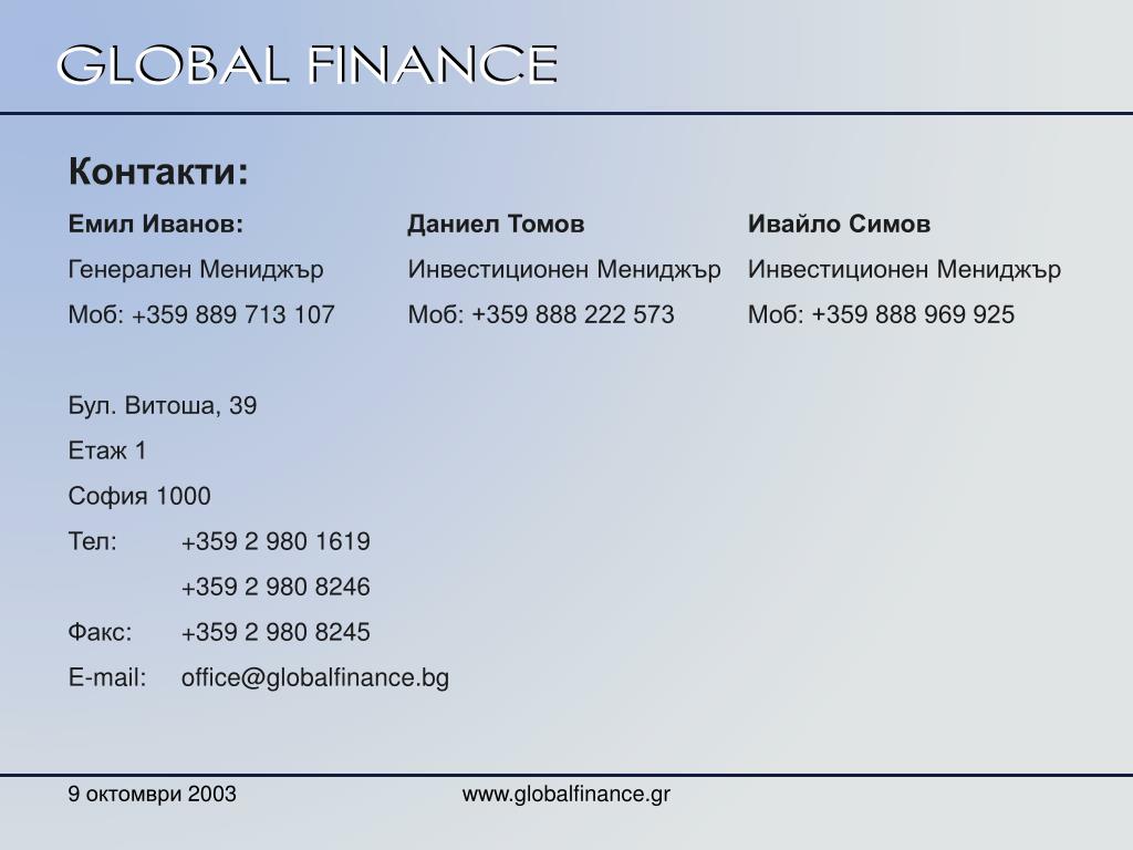 Контакти: Емил Иванов: Даниел Томов Ивайло Симов Генерален Мениджър Инвестиционен Мениджър Инвестиционен Мениджър Моб: +359 889 713 107 Моб: +359 888 222 573 Моб: +359 888 969 925 Бул. Витоша, 39 Етаж 1 София 1000 Тел: +359 2 980 1619 +359 2 980 8246 Факс: +359 2 980 8245 E-mail: office@globalfinance.bg www.globalfinance.gr