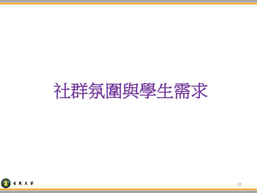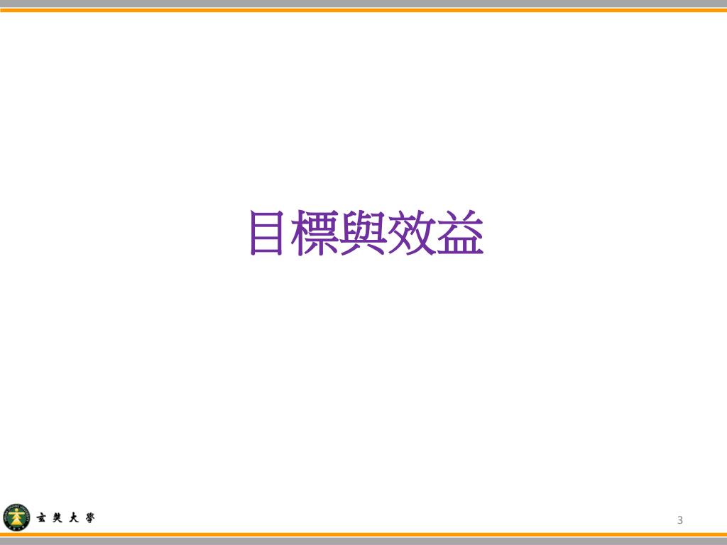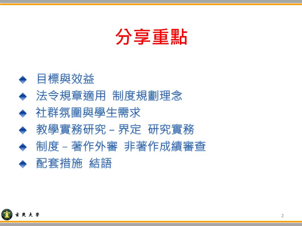 分享重點 • 目標與效益 • 法令規章適用 制度規劃理念 • 社群氛圍與學生需求 • 教學實務研究–界定研究實務 • 制度–著作外審 非著作成績審查 • 配套措施 結語