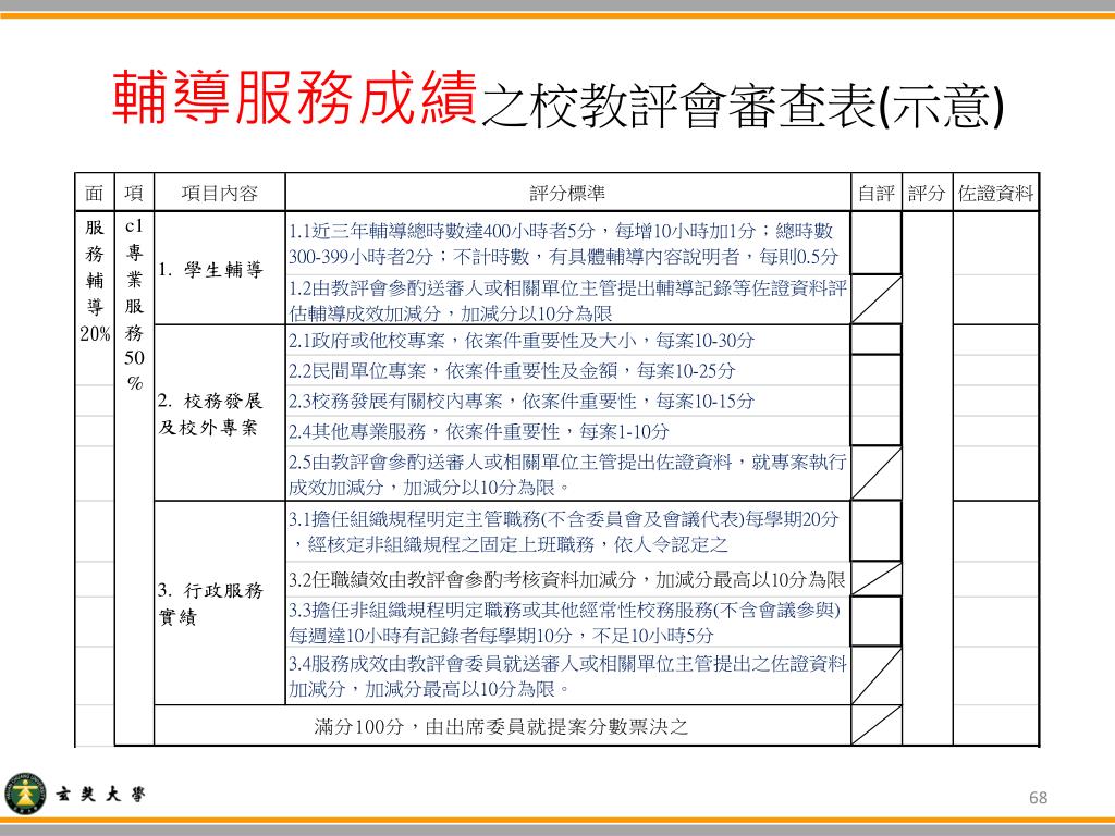 輔導服務成績內涵–校教評會 專業服務50%。 就學生輔導、校內外委辦、合作或補助專案量、校務研發、行政服務實績及其他校內外服務成效之質性評估評定分數。 服務評鑑30%。 以全校近三年服務評鑑分數平均之相對分數為基本分,由教評會參酌評鑑及升等申請人自提之佐證資料加減0-10分後評定分數。 綜合審評20%。 由教評會綜合本條第一、二款評估結果對學校之整體貢獻及其他服務實績評定分數。