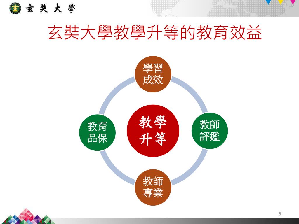 玄奘大學教學升等的直接效益 • 引發教學實務的研究與研討風氣 ● • 累積適合本校學生特質的教學方案及重點教材 • 教案 + 重點教材/全科教材 • 運用常見教學設計模式/教學法 • 發展適性之綜合教學方案 • 互動式數位教材 • 建構證據導向的教學準備與學習成效評估典範 • 先備特質與學習行為分析 • 學習成效評估與趨勢分析