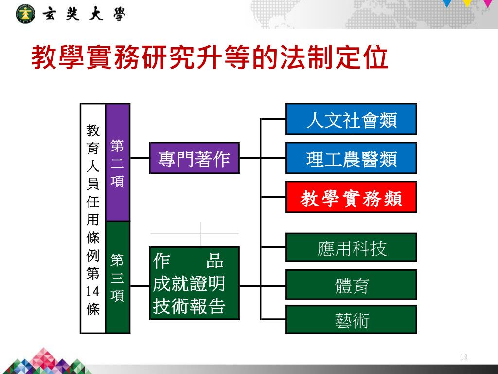 不修法且普遍適用的考量 • 教育人員任用條例:第 14 條專門著作審查合格者,始得升等。以技能為主之教師聘任或升等,得以作品、成就證明或技術報告代替專門著作送審 • 教育人員任用條例16-18條 明定具「專門著作」始得升等 • 專科以上學校教師資格審定辦法:規定原創性及技術報告類科限制