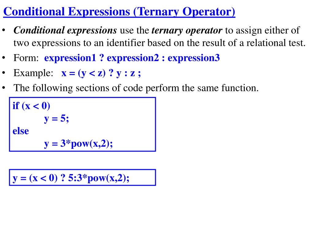 Conditional Expressions (Ternary Operator) Conditional expressions use the ternary operator to assign either of two expressions to an identifier based on the result of a relational test. Form: expression1 ? expression2 : expression3 Example: x = (y < z) ? y : z ; The following sections of code perform the same function. if (x < 0) y = 5; else y = 3*pow(x,2); y = (x < 0) ? 5:3*pow(x,2);
