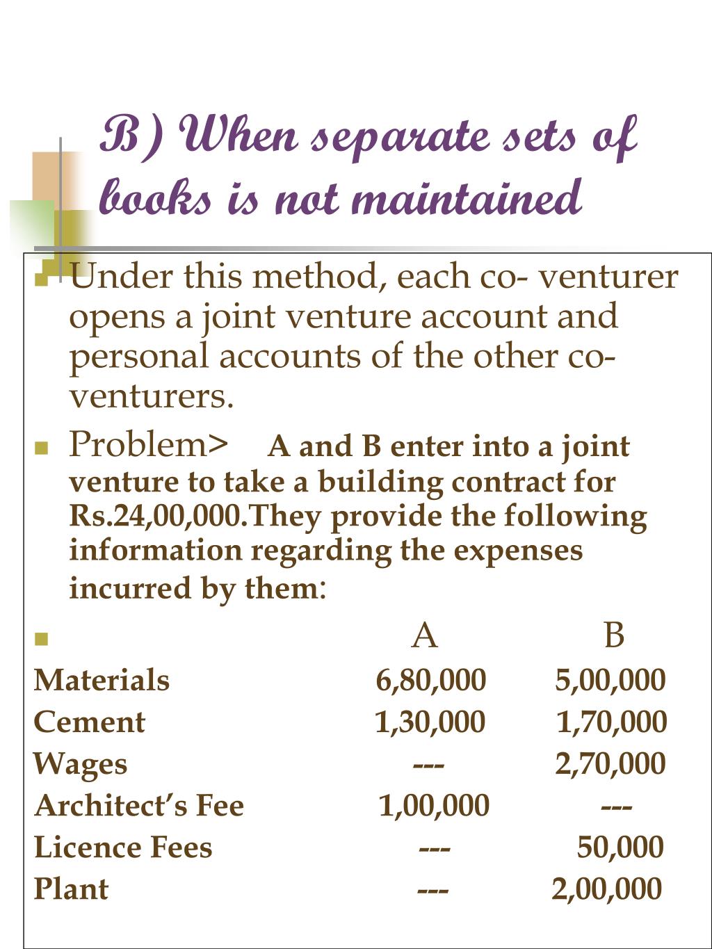 B) When separate sets of books is not maintained • Under this method, each co- venturer opens a joint venture account and personal accounts of the other co- venturers. • Problem> A and B enter into a joint venture to take a building contract for Rs.24,00,000.They provide the following information regarding the expenses incurred by them: • A B Materials 6,80,000 5,00,000 Cement 1,30,000 1,70,000 Wages --- 2,70,000 Architect’s Fee 1,00,000 --- Licence Fees --- 50,000 Plant --- 2,00,000