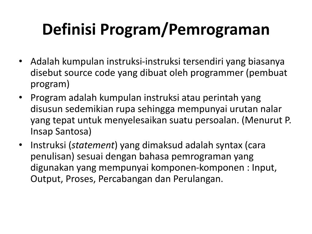Definisi Program/Pemrograman • Adalah kumpulan instruksi-instruksi tersendiri yang biasanya disebut source code yang dibuat oleh programmer (pembuat program) • Program adalah kumpulan instruksi atau perintah yang disusun sedemikian rupa sehingga mempunyai urutan nalar yang tepat untuk menyelesaikan suatu persoalan. (Menurut P. Insap Santosa) • Instruksi (statement) yang dimaksud adalah syntax (cara penulisan) sesuai dengan bahasa pemrograman yang digunakan yang mempunyai komponen-komponen : Input, Output, Proses, Percabangan dan Perulangan.