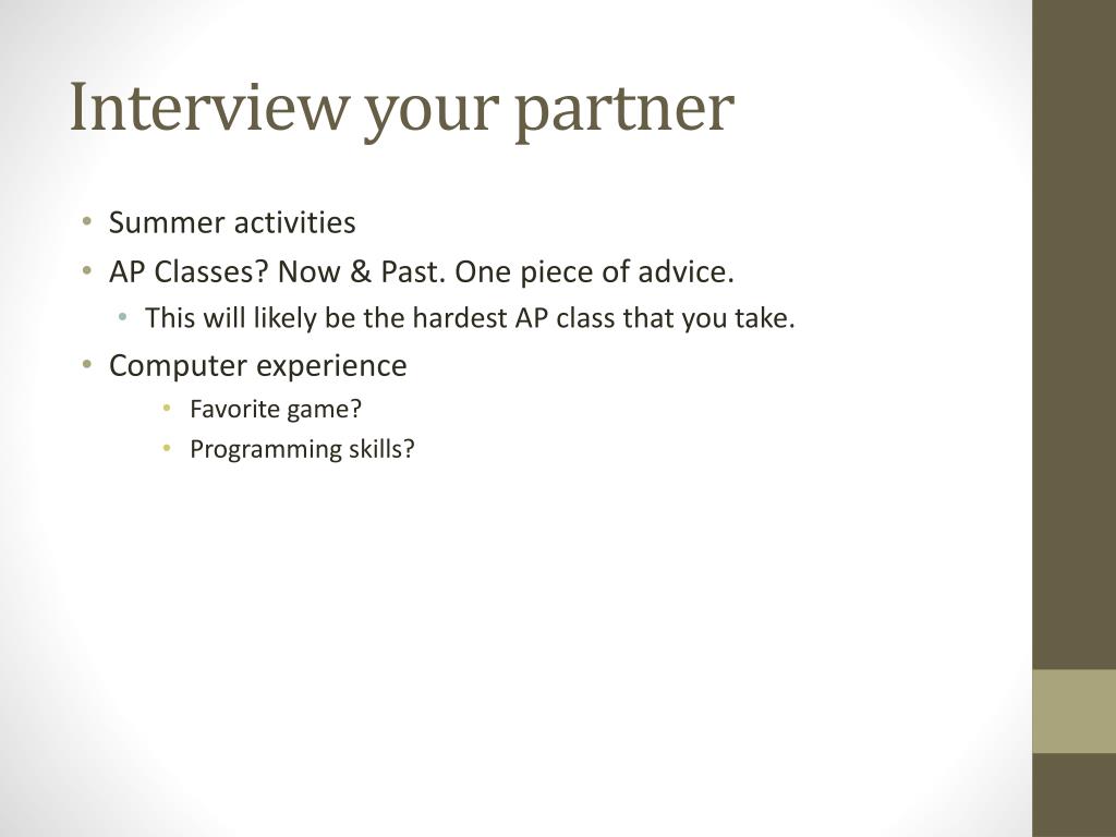Interview your partner • Summer activities • AP Classes? Now & Past. One piece of advice. • This will likely be the hardest AP class that you take. • Computer experience • Favorite game? • Programming skills?