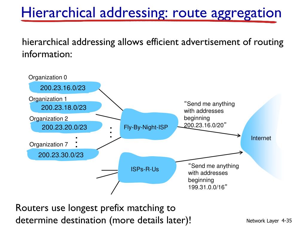 200.23.16.0/23 200.23.18.0/23 200.23.30.0/23 200.23.20.0/23 . . . . . . Hierarchical addressing: route aggregation hierarchical addressing allows efficient advertisement of routing information: Organization 0 Organization 1 “Send me anything with addresses beginning 200.23.16.0/20” Organization 2 Fly-By-Night-ISP Internet Organization 7 “Send me anything with addresses beginning 199.31.0.0/16” ISPs-R-Us Routers use longest prefix matching to determine destination (more details later)! Network Layer
