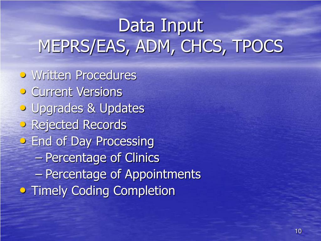 Data InputMEPRS/EAS, ADM, CHCS, TPOCS • Written Procedures • Current Versions • Upgrades & Updates • Rejected Records • End of Day Processing • Percentage of Clinics • Percentage of Appointments • Timely Coding Completion