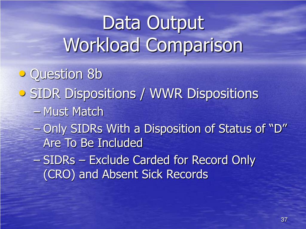 Data OutputWorkload Comparison • Question 8b • SIDR Dispositions / WWR Dispositions • Must Match • Only SIDRs With a Disposition of Status of “D” Are To Be Included • SIDRs – Exclude Carded for Record Only (CRO) and Absent Sick Records