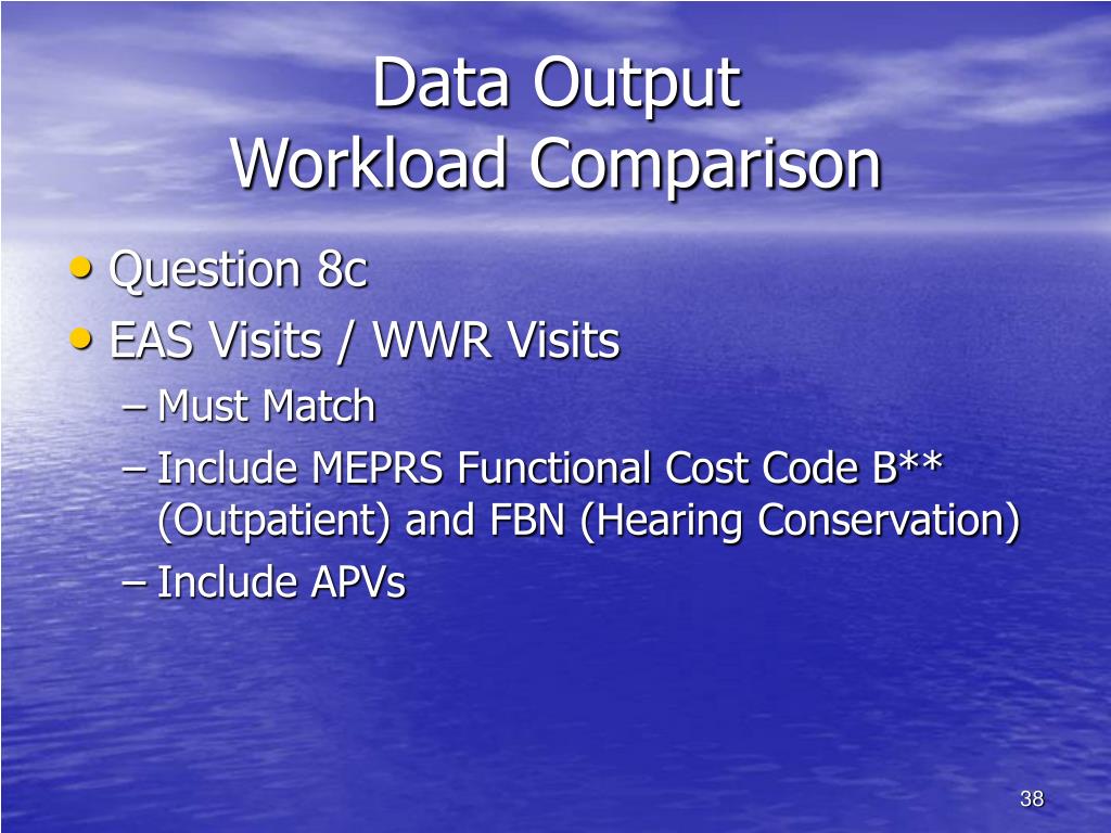 Data OutputWorkload Comparison • Question 8c • EAS Visits / WWR Visits • Must Match • Include MEPRS Functional Cost Code B** (Outpatient) and FBN (Hearing Conservation) • Include APVs