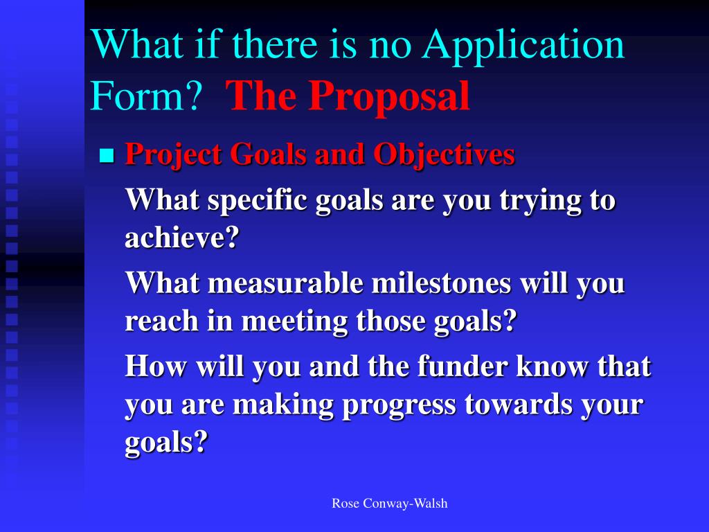 What if there is no Application Form? The Proposal • Project Goals and Objectives What specific goals are you trying to achieve? What measurable milestones will you reach in meeting those goals? How will you and the funder know that you are making progress towards your goals? Rose Conway-Walsh