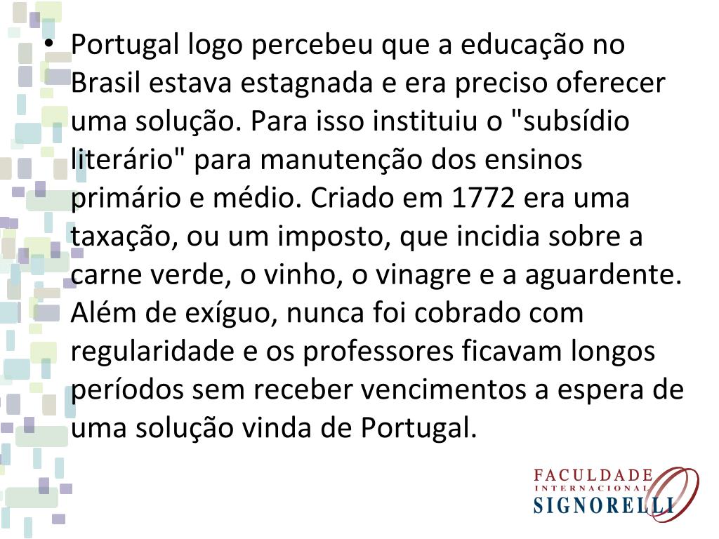 Portugal logo percebeu que a educação no Brasil estava estagnada e era preciso oferecer uma solução. Para isso instituiu o "subsídio literário" para manutenção dos ensinos primário e médio. Criado em 1772 era uma taxação, ou um imposto, que incidia sobre a carne verde, o vinho, o vinagre e a aguardente. Além de exíguo, nunca foi cobrado com regularidade e os professores ficavam longos períodos sem receber vencimentos a espera de uma solução vinda de Portugal.