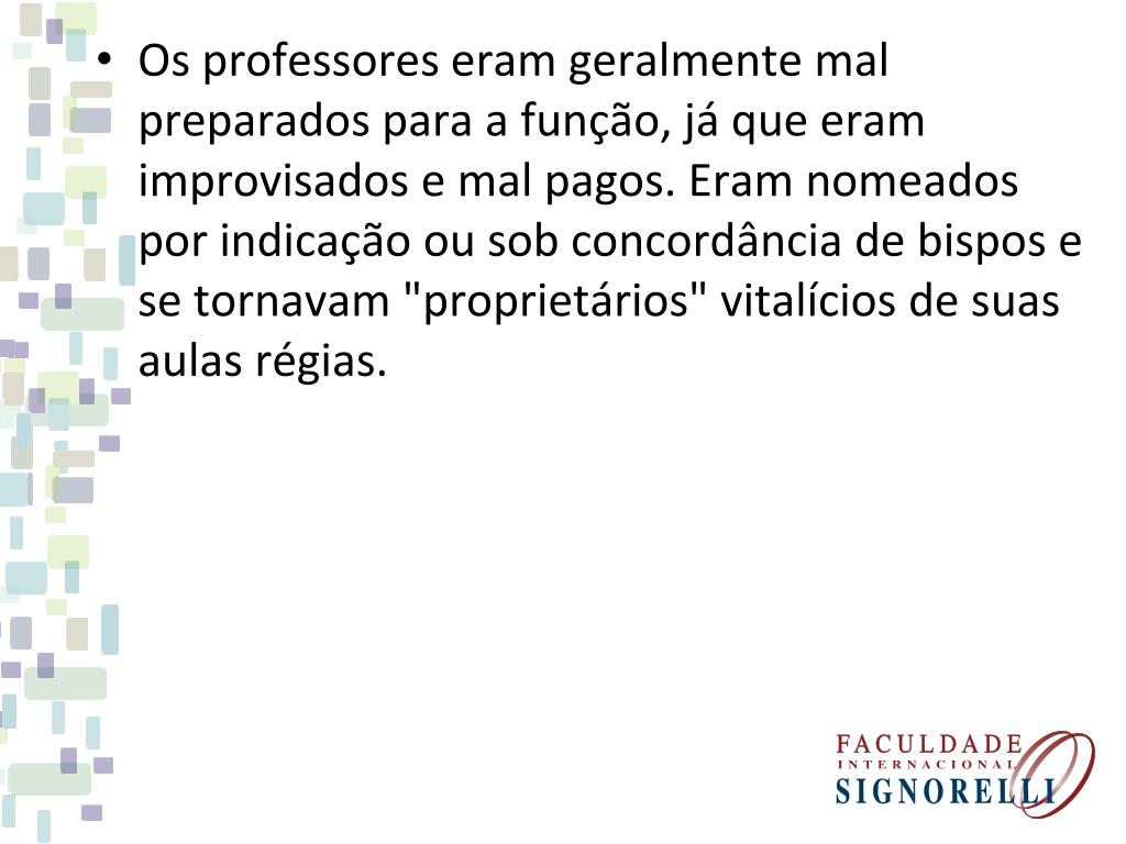 Os professores eram geralmente mal preparados para a função, já que eram improvisados e mal pagos. Eram nomeados por indicação ou sob concordância de bispos e se tornavam "proprietários" vitalícios de suas aulas régias.