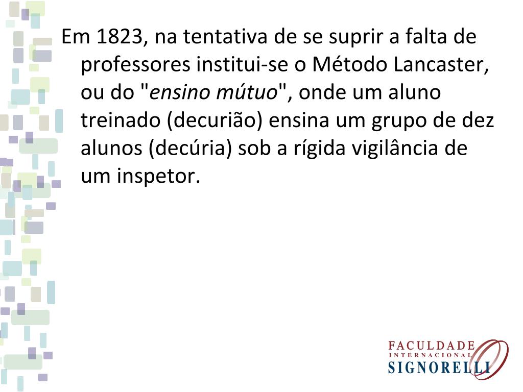 Em 1823, na tentativa de se suprir a falta de professores institui-se o Método Lancaster, ou do "ensino mútuo", onde um aluno treinado (decurião) ensina um grupo de dez alunos (decúria) sob a rígida vigilância de um inspetor.