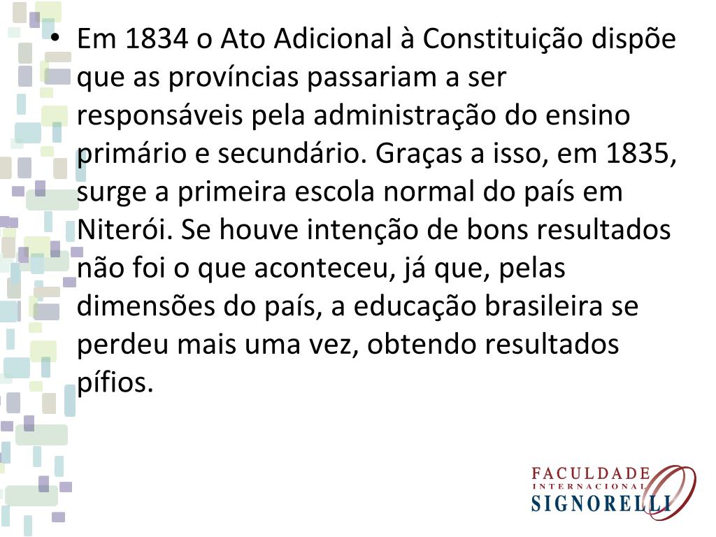 Em 1834 o Ato Adicional à Constituição dispõe que as províncias passariam a ser responsáveis pela administração do ensino primário e secundário. Graças a isso, em 1835, surge a primeira escola normal do país em Niterói. Se houve intenção de bons resultados não foi o que aconteceu, já que, pelas dimensões do país, a educação brasileira se perdeu mais uma vez, obtendo resultados pífios.