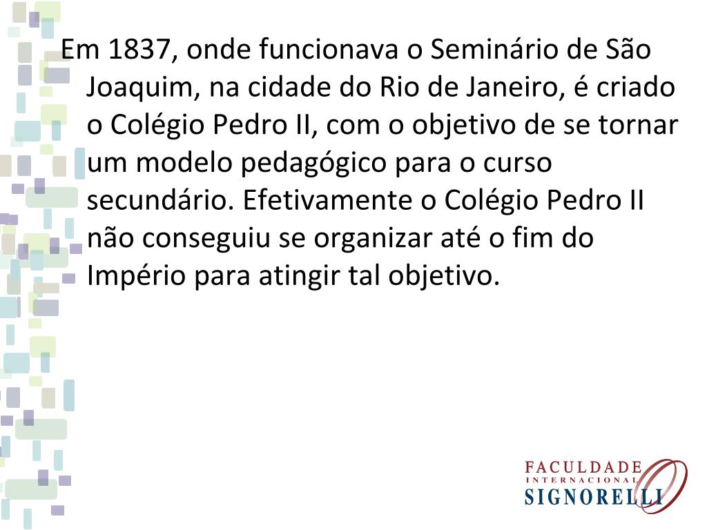 Em 1837, onde funcionava o Seminário de São Joaquim, na cidade do Rio de Janeiro, é criado o Colégio Pedro II, com o objetivo de se tornar um modelo pedagógico para o curso secundário. Efetivamente o Colégio Pedro II não conseguiu se organizar até o fim do Império para atingir tal objetivo.