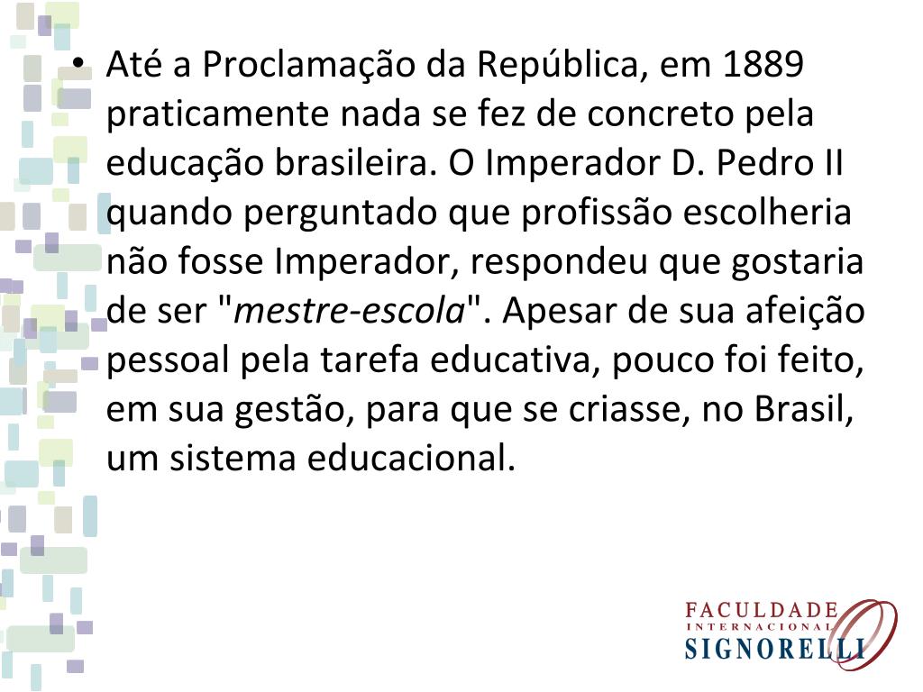 Até a Proclamação da República, em 1889 praticamente nada se fez de concreto pela educação brasileira. O Imperador D. Pedro II quando perguntado que profissão escolheria não fosse Imperador, respondeu que gostaria de ser "mestre-escola". Apesar de sua afeição pessoal pela tarefa educativa, pouco foi feito, em sua gestão, para que se criasse, no Brasil, um sistema educacional.