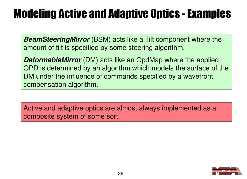 Modeling Active and Adaptive Optics - Examples BeamSteeringMirror (BSM) acts like a Tilt component where the amount of tilt is specified by some steering algorithm. DeformableMirror (DM) acts like an OpdMap where the applied OPD is determined by an algorithm which models the surface of the DM under the influence of commands specified by a wavefront compensation algorithm. Active and adaptive optics are almost always implemented as a composite system of some sort.