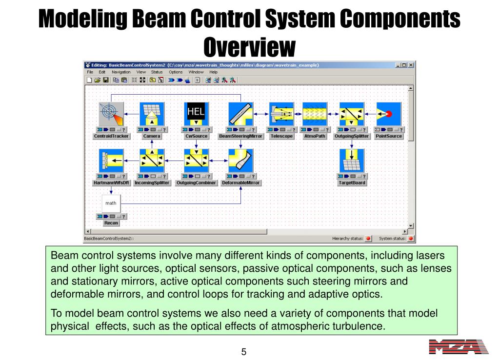 Modeling Beam Control System ComponentsOverview Beam control systems involve many different kinds of components, including lasers and other light sources, optical sensors, passive optical components, such as lenses and stationary mirrors, active optical components such steering mirrors and deformable mirrors, and control loops for tracking and adaptive optics. To model beam control systems we also need a variety of components that model physical effects, such as the optical effects of atmospheric turbulence.