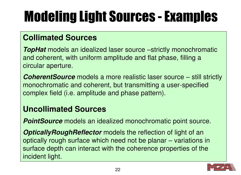 Modeling Light Sources - Examples Collimated Sources TopHatmodels an idealized laser source –strictly monochromatic and coherent, with uniform amplitude and flat phase, filling a circular aperture. CoherentSource models a more realistic laser source – still strictly monochromatic and coherent, but transmitting a user-specified complex field (i.e. amplitude and phase pattern). Uncollimated Sources PointSource models an idealized monochromatic point source. OpticallyRoughReflector models the reflection of light of an optically rough surface which need not be planar – variations in surface depth can interact with the coherence properties of the incident light.