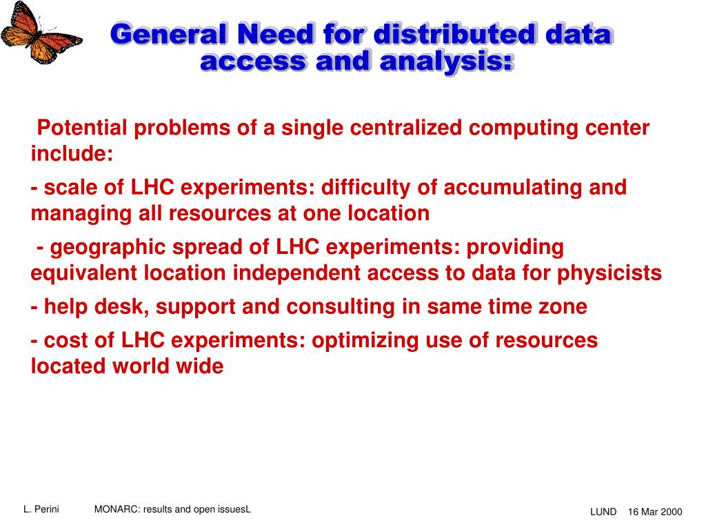 General Need for distributed data access and analysis: • Potential problems of a single centralized computing center include: • - scale of LHC experiments: difficulty of accumulating and managing all resources at one location • - geographic spread of LHC experiments: providing equivalent location independent access to data for physicists • - help desk, support and consulting in same time zone • - cost of LHC experiments: optimizing use of resources located world wide