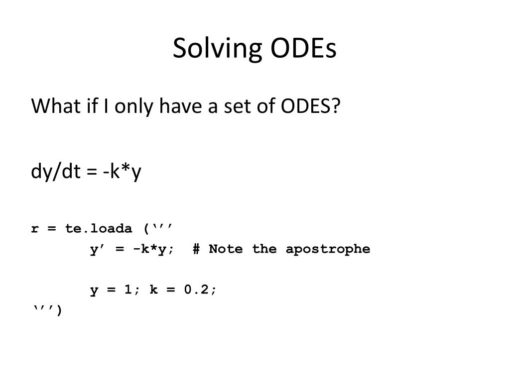 Solving ODEs What if I only have a set of ODES? dy/dt = -k*y r = te.loada (‘’’ y’ = -k*y; # Note the apostrophe y = 1; k = 0.2; ‘’’)