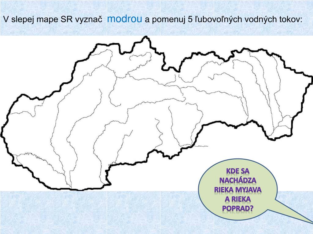 V slepej mape SR vyznač modrou a pomenuj 5 ľubovoľných vodných tokov: Kde sa nachádza rieka Myjava a rieka Poprad?