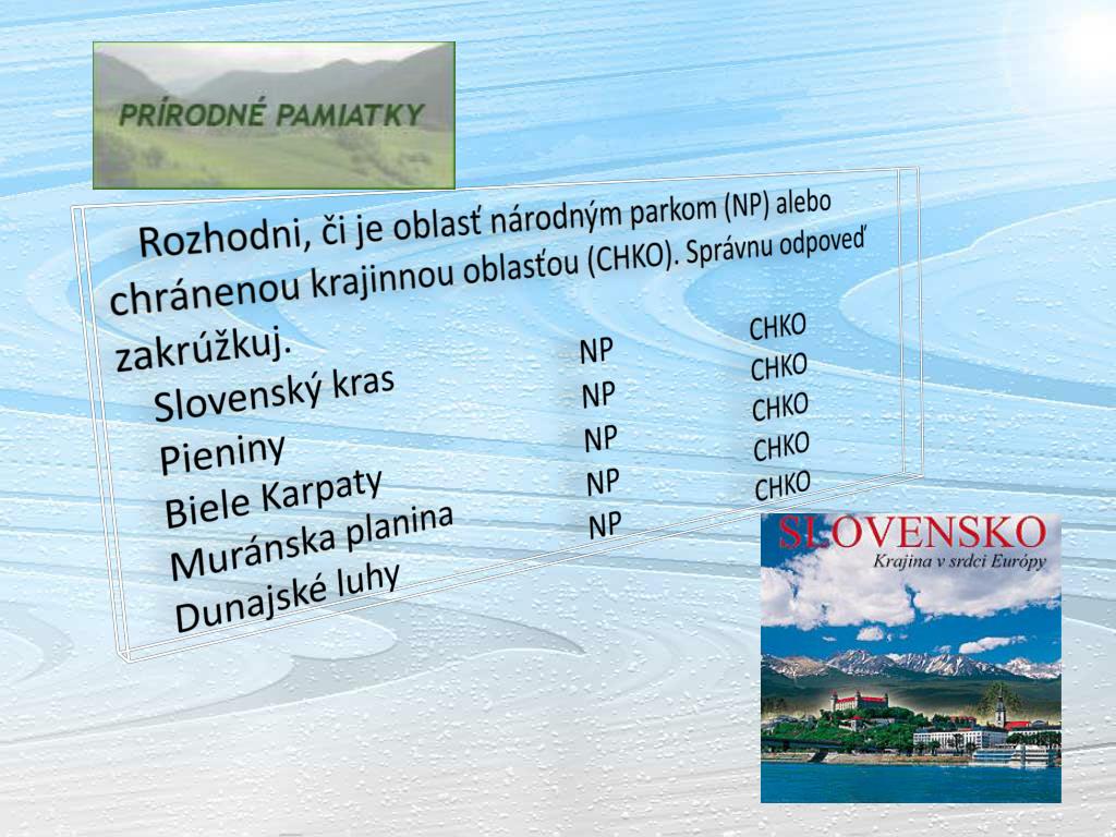 Rozhodni, či je oblasť národným parkom (NP) alebo chránenou krajinnou oblasťou (CHKO). Správnu odpoveď zakrúžkuj. Slovenský kras NP CHKO Pieniny NP CHKO Biele Karpaty NP CHKO Muránska planina NP CHKO Dunajské luhy NP CHKO