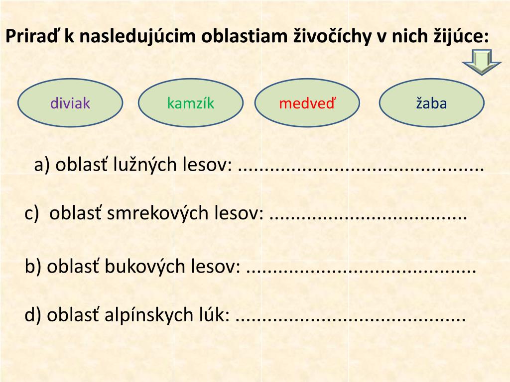 Priraď k nasledujúcim oblastiam živočíchy v nich žijúce: a) oblasť lužných lesov: .............................................. c) oblasť smrekových lesov: ..................................... b) oblasť bukových lesov: ........................................... d) oblasť alpínskych lúk: ........................................... diviak kamzík medveď žaba