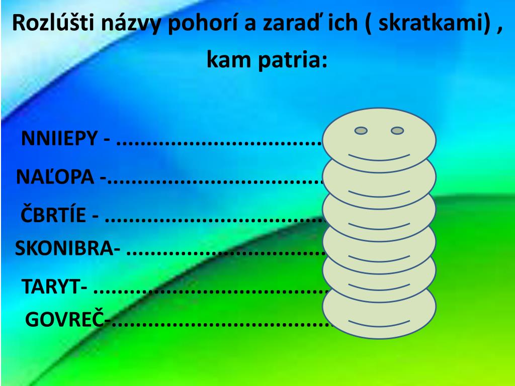 Rozlúšti názvy pohorí a zaraď ich ( skratkami) , kam patria: NNIIEPY - ....................................Pieniny... NAĽOPA -......................................Poľana... ČBRTÍE - ......................................Tríbeč..... SKONIBRA- ..................................Branisko. TARYT- ........................................Tatry...... GOVREČ-.....................................Čergov...