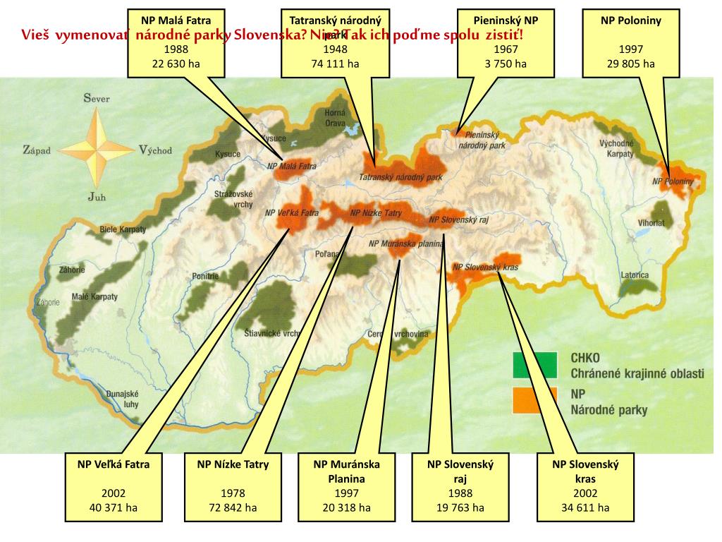 NP Malá Fatra 1988 22 630 ha Tatranský národný park 1948 74 111 ha Pieninský NP 1967 3 750 ha NP Poloniny 1997 29 805 ha Vieš vymenovať národné parky Slovenska? Nie? Tak ich poďme spolu zistiť! NP Veľká Fatra 2002 40 371 ha NP Nízke Tatry 1978 72 842 ha NP Muránska Planina 1997 20 318 ha NP Slovenský raj 1988 19 763 ha NP Slovenský kras 2002 34 611 ha