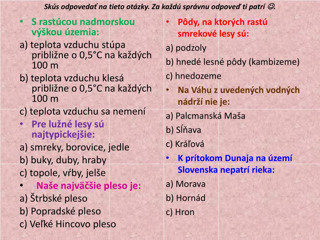 Skús odpovedať na tieto otázky. Za každú správnu odpoveď ti patrí . Pôdy, na ktorých rastú smrekové lesy sú: a) podzoly b) hnedé lesné pôdy (kambizeme) c) hnedozeme Na Váhu z uvedených vodných nádrží nie je: a) Palcmanská Maša b) Sĺňava c) Kráľová K prítokom Dunaja na území Slovenska nepatrí rieka: a) Morava b) Hornád c) Hron • S rastúcou nadmorskou výškou územia: a) teplota vzduchu stúpa približne o 0,5°C na každých 100 m b) teplota vzduchu klesá približne o 0,5°C na každých 100 m c) teplota vzduchu sa nemení • Pre lužné lesy sú najtypickejšie: a) smreky, borovice, jedle b) buky, duby, hraby c) topole, vŕby, jelše • Naše najväčšie pleso je: a) Štrbské pleso b) Popradské pleso c) Veľké Hincovo pleso